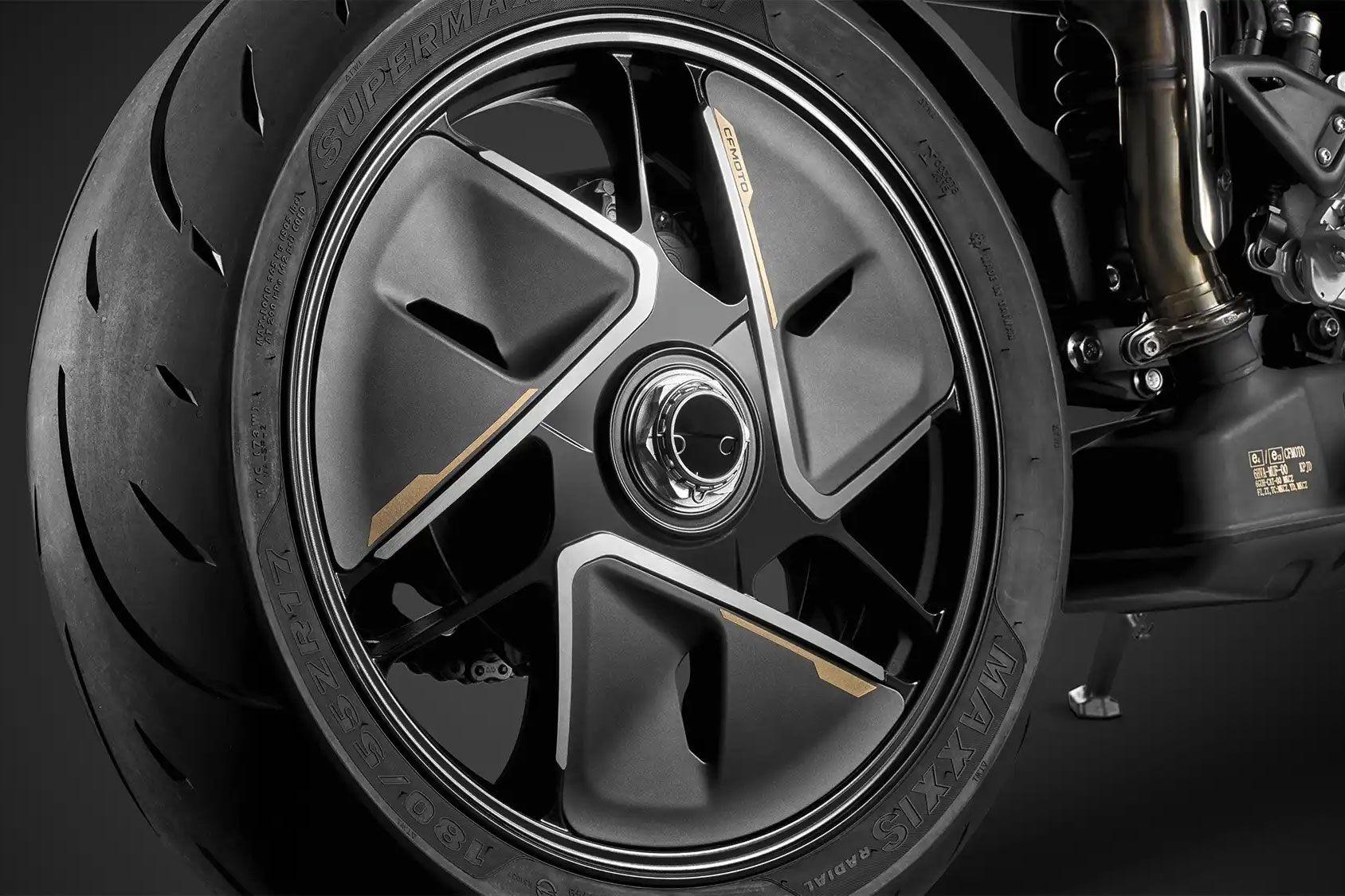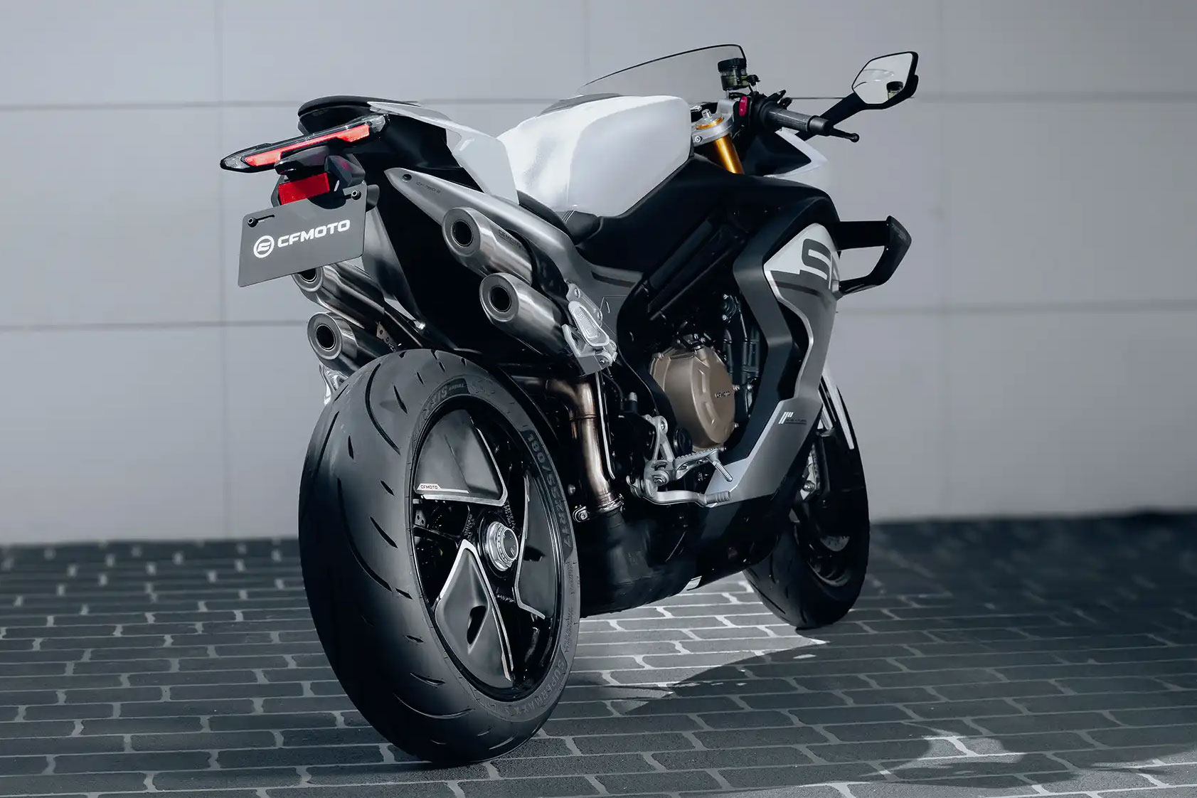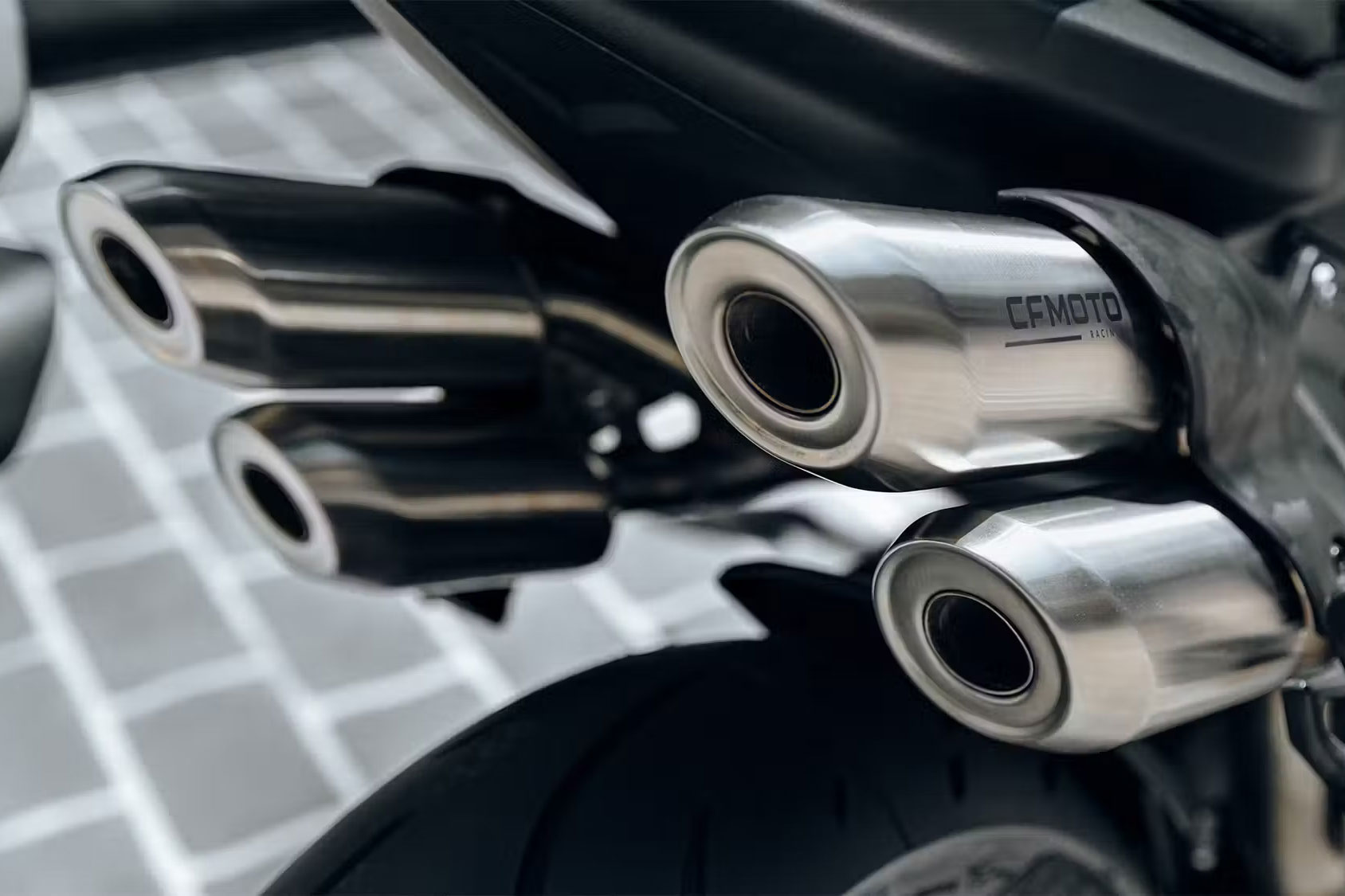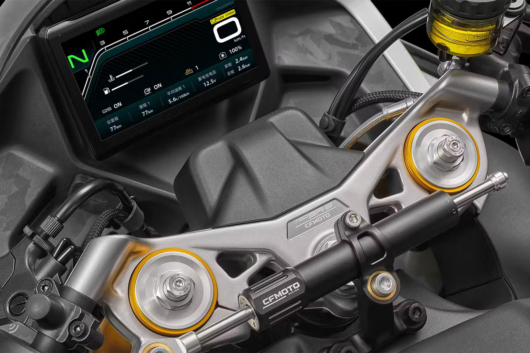 Beim Fahrwerk setzt CFMoto auf KYB-Komponenten, vorne wie hinten voll einstellbar. In Sachen Bremse greift man gleich zur Oberliga: Brembo-Monoblock-Sättel und 320er Scheiben vorne – da braucht’s keine Ausreden, wenn man mal später in die Eisen steigt.