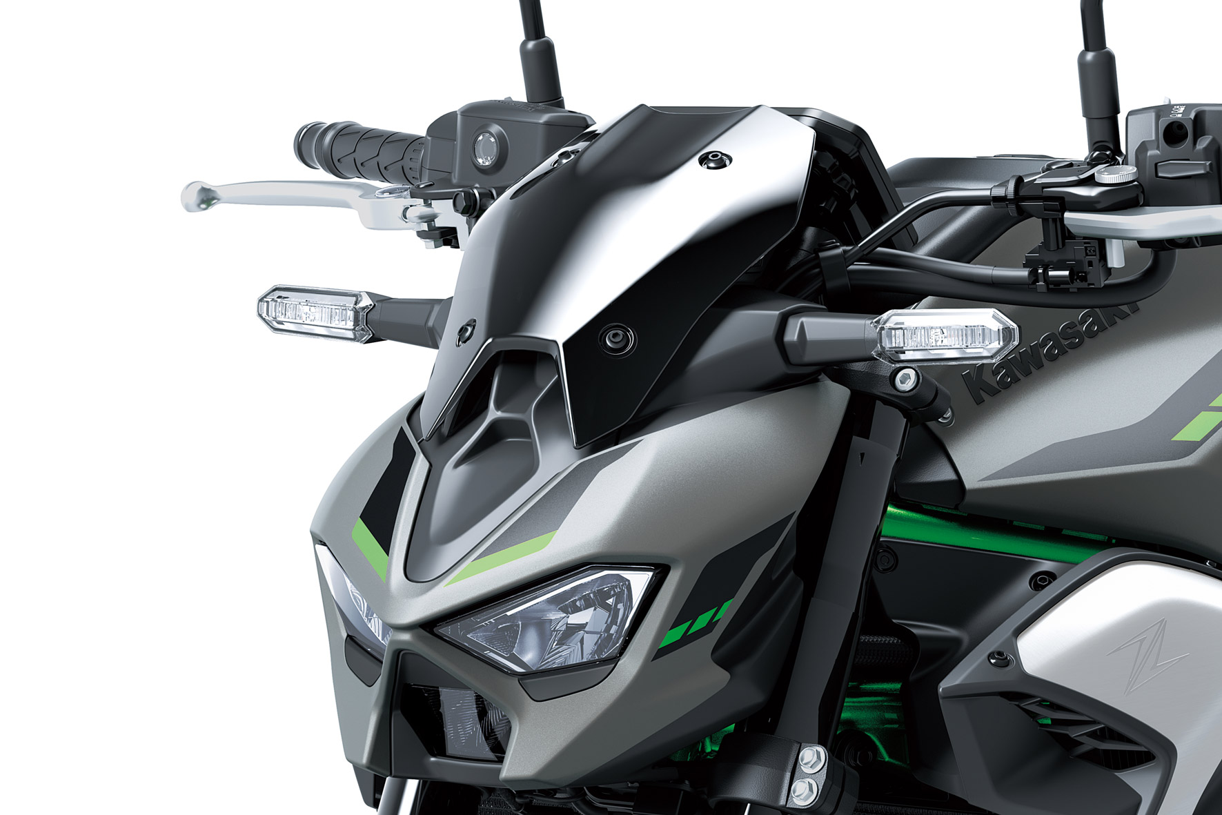 Das neu definierte Sugomi-Design besticht durch ein markantes, kantiges Styling und den geschickten Einsatz von Metallteilen, die die kraftvolle Performance im Inneren perfekt widerspiegeln. Ein markantes Merkmal der neu gestalteten Frontpartie sind die präzisen, kompakten Scheinwerfer und das fortschrittliche LED-Rücklicht, das ein futuristisches Design mit moderner Technik bietet. Neue Seitenverkleidungen aus gebürstetem Aluminium und weitere Akzente verleihen der Z900 einen edlen, metallischen Look. Der neue, komfortablere Sitz ist flacher gestaltet, um dem Fahrer einen einfachen Positionswechsel zu ermöglichen und den Blick auf das große, volldigitale 5-Zoll-TFT-Farbinstrument zu lenken.