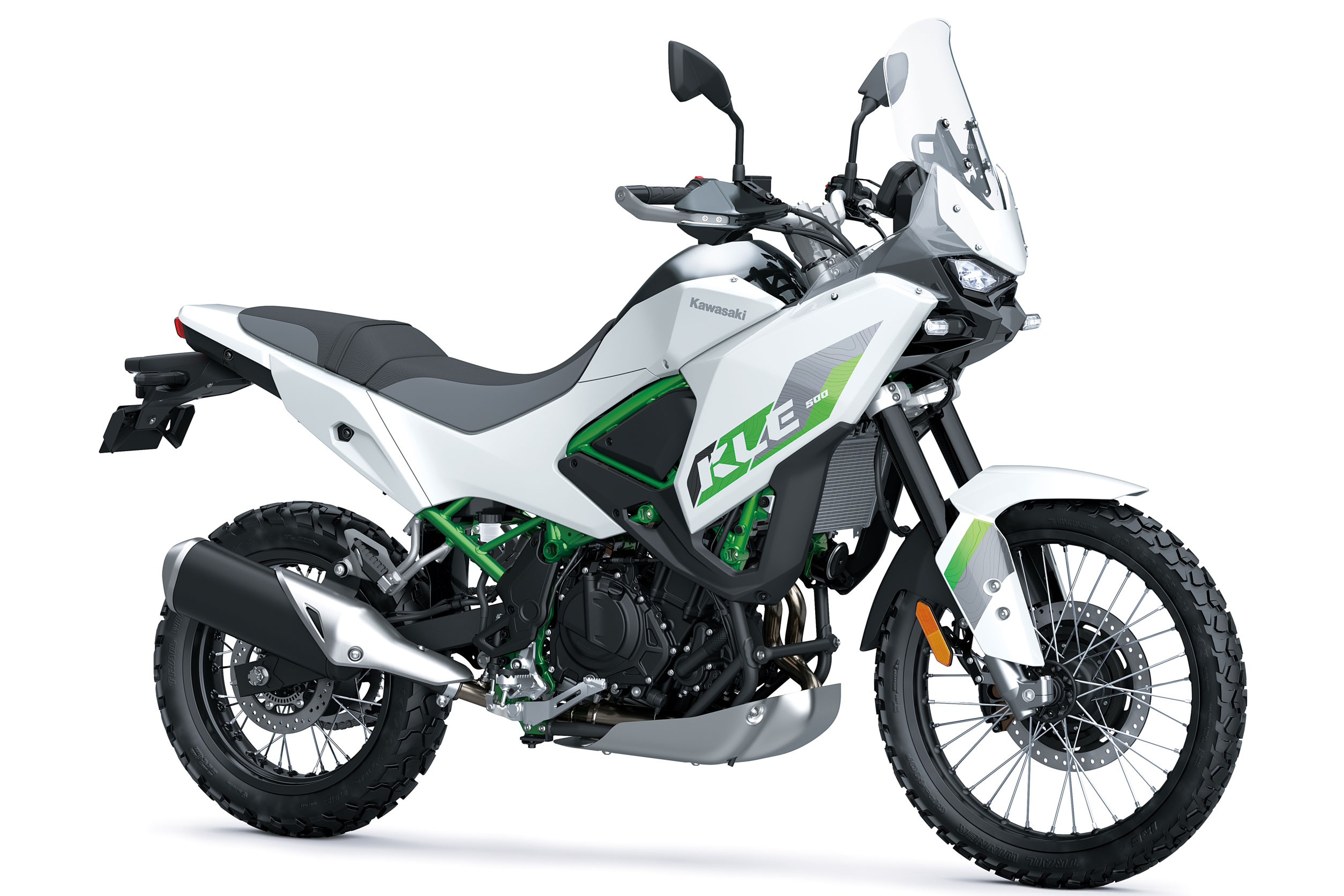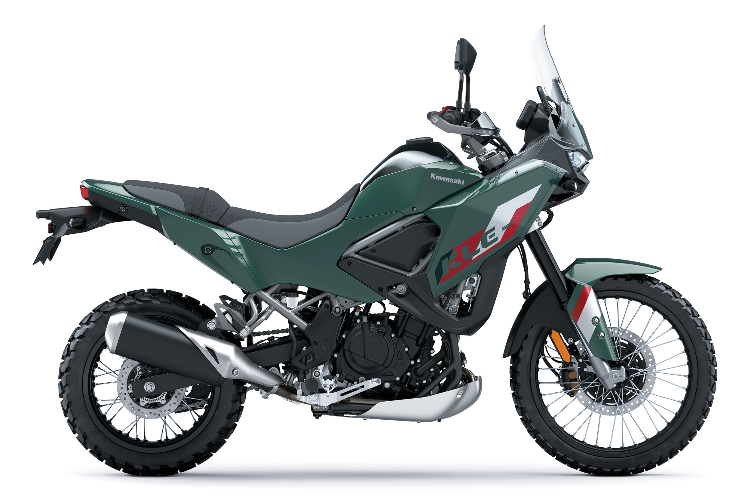 Optisch lehnt sich die neue KLE500 deutlich an Kawasakis große Rallye-Vorbilder an. Die hohe Frontverkleidung mit verstellbarem Windschild, der schlanke 16-Liter-Tank und die fließenden Linien der Seitenverkleidungen verleihen ihr eine sportlich-kompakte Silhouette. Robust, funktional und unverwechselbar. Dazu kommen 21-Zoll-Vorderrad, zweistufige Sitzbank und markante KX-Motocross-Elemente, die maximale Bewegungsfreiheit auf und abseits der Straße bieten. Mit dem optionalen ERGO-FIT-Soziussitz lässt sich die Sitzbank zudem zu einer durchgehenden Einheit kombinieren. Perfekt für den Offroad-Look mit echtem Rallye-Feeling.