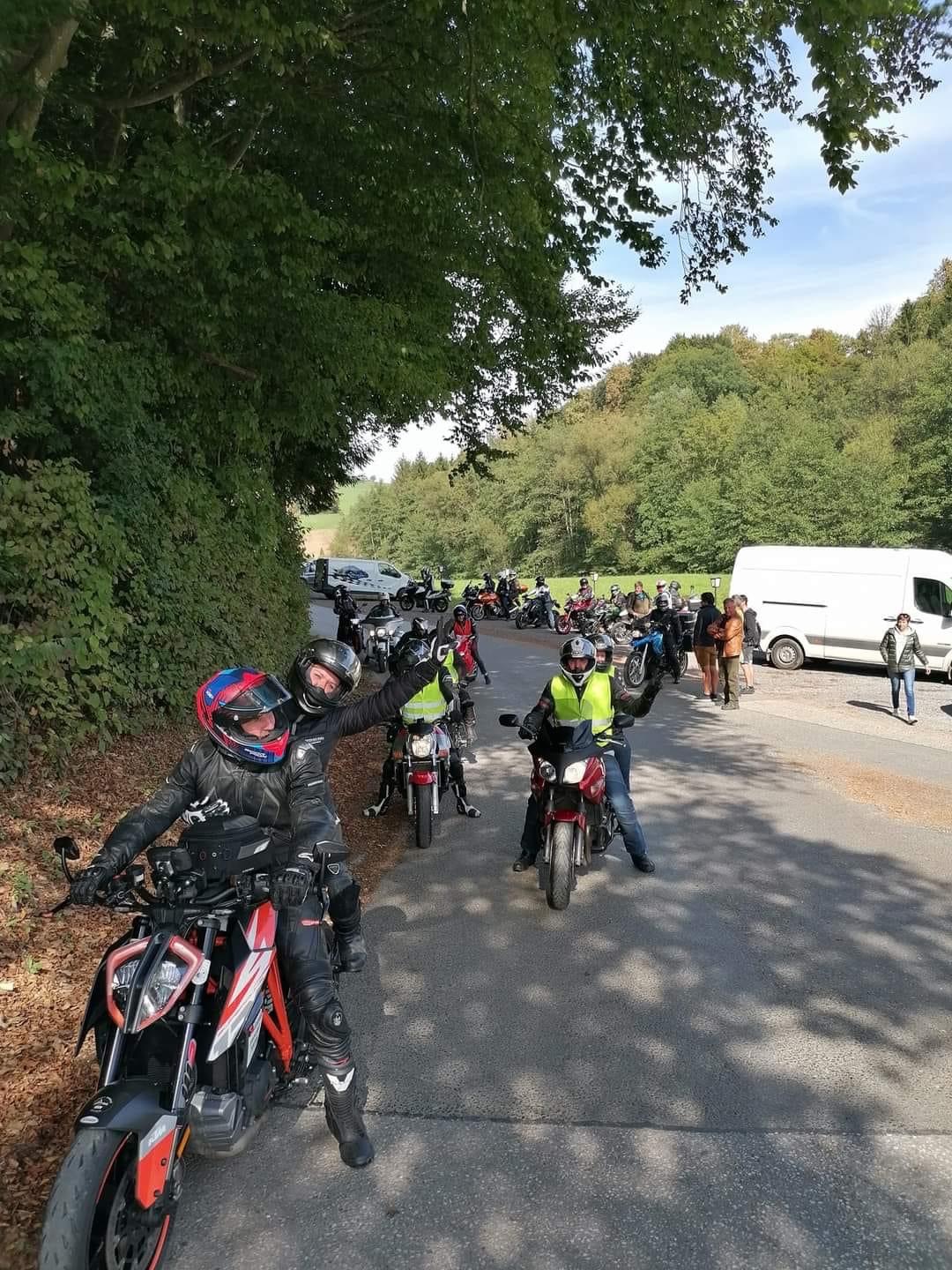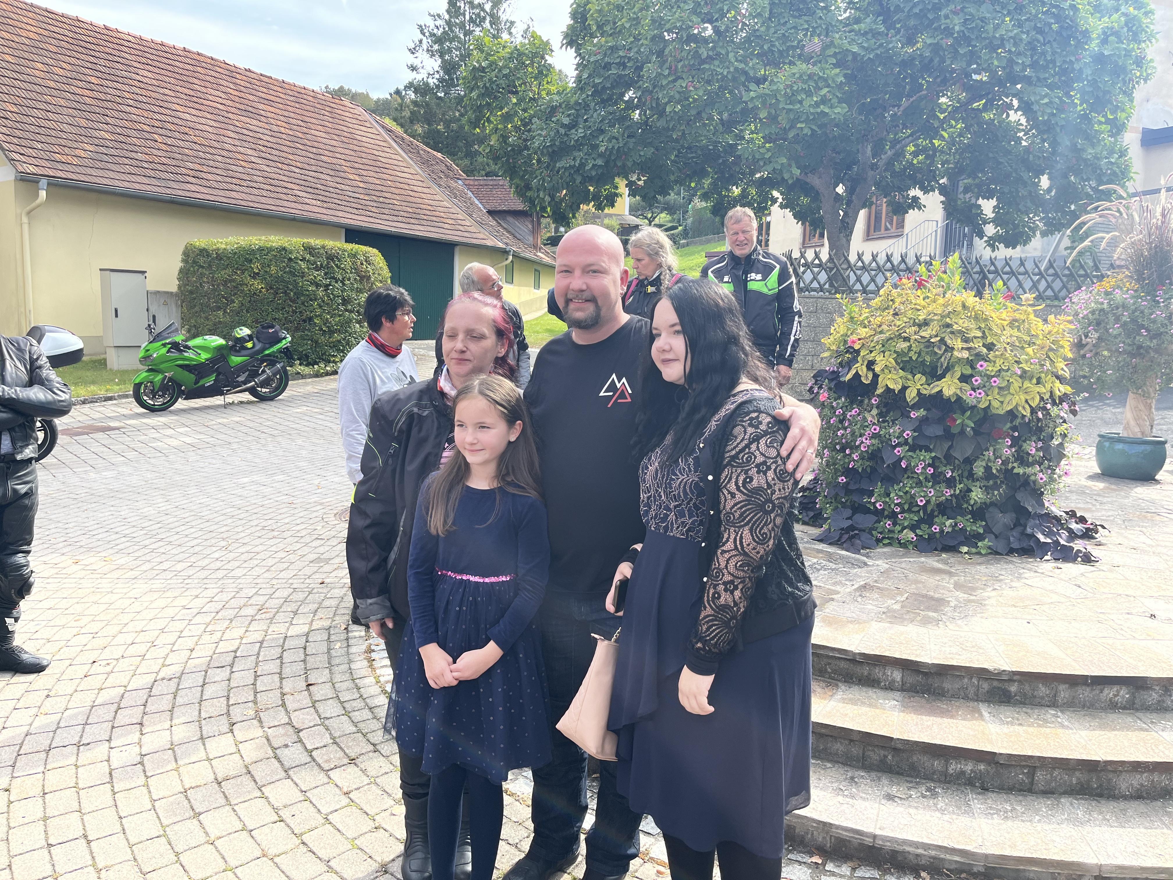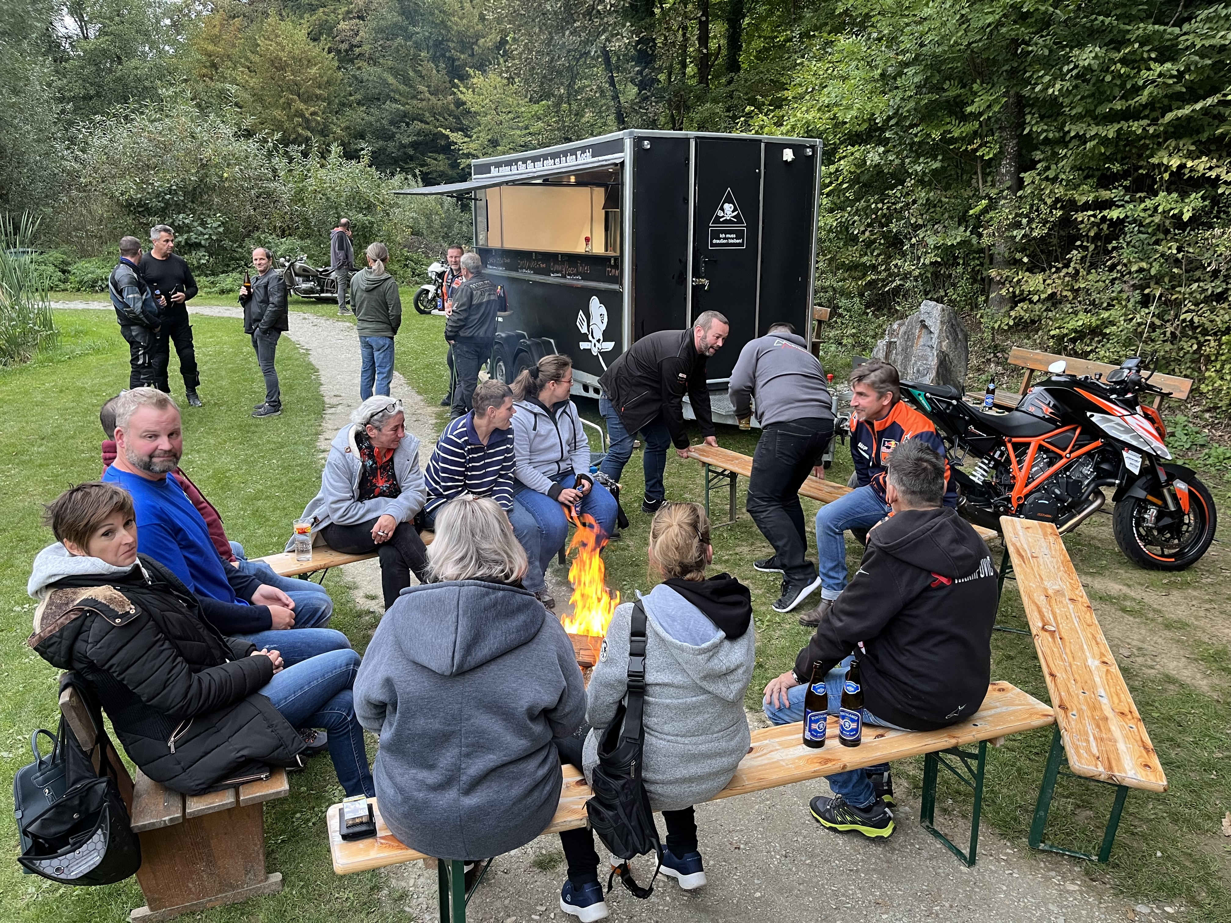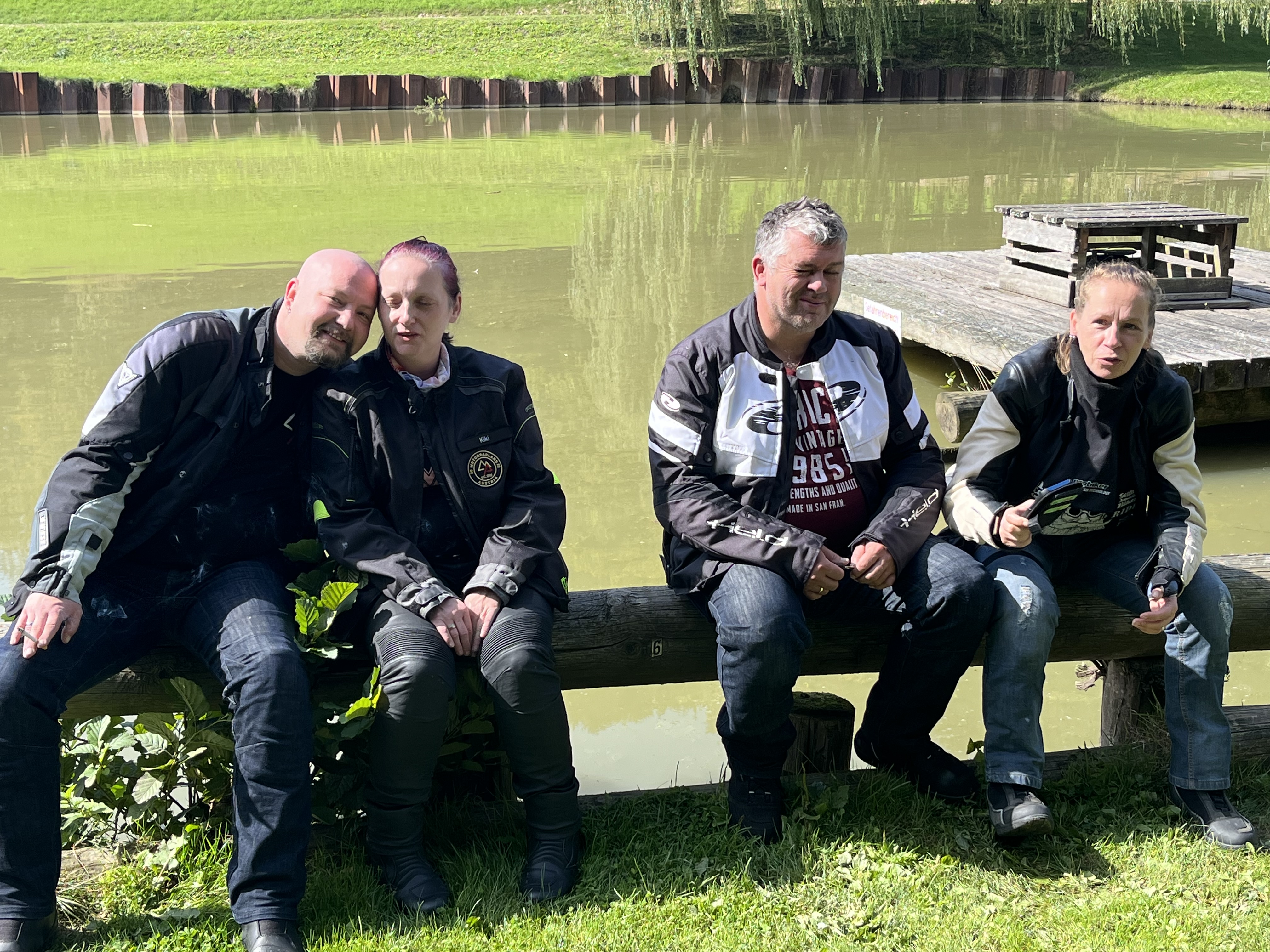 Die gemeinsame Ausfahrt startete um 13.15 Uhr. Die Route führte durch die südliche Steiermark bis zur Kirche in Loipersdorf. Hier gab es zur Überraschung aller eine besondere Aktion. Ein teilnehmendes Pärchen beging sein 20-jährige Ehejubiläum und gab sich zur Feier erneut das JA-Wort. Schließlich, und mit Gottes Segen, kehrten alle Biker gegen 16.00 Uhr zurück zum Teich. Ab jetzt standen Benzingespräche, Drinks und Food sowie viel Gelächter am Programm. Bis spät in die Nacht wurde ausgelassen am Lagerfeuer gefeiert.