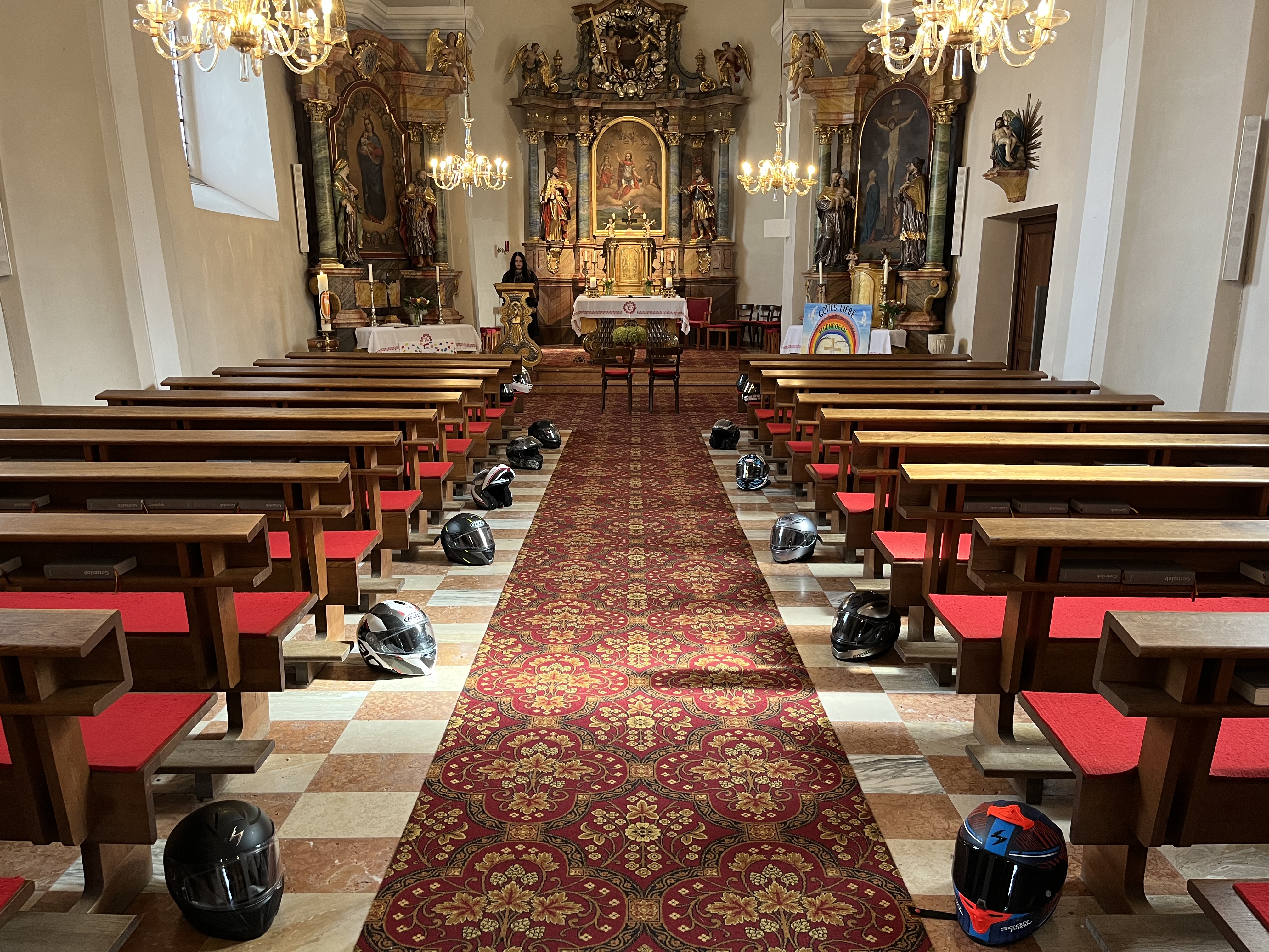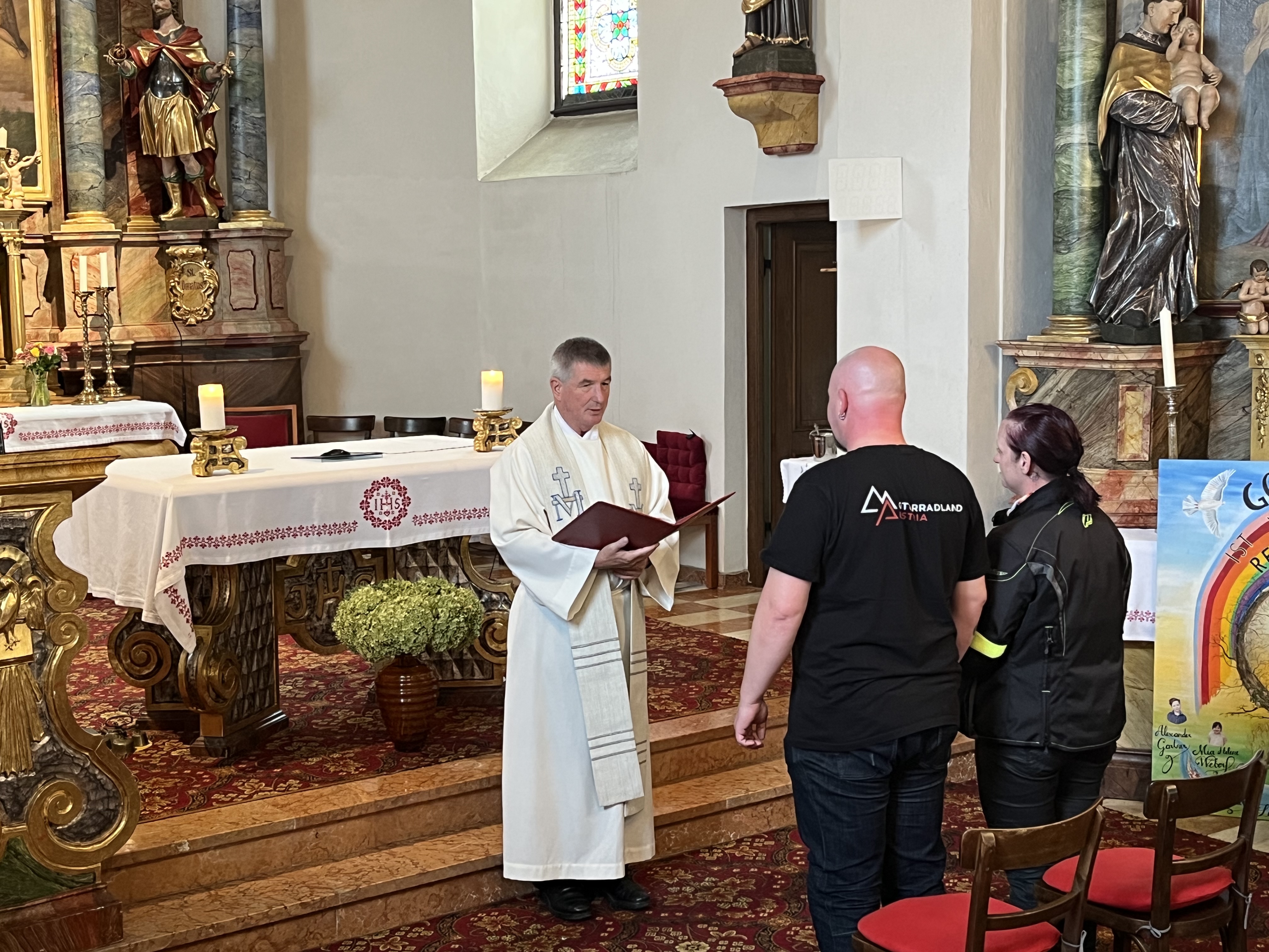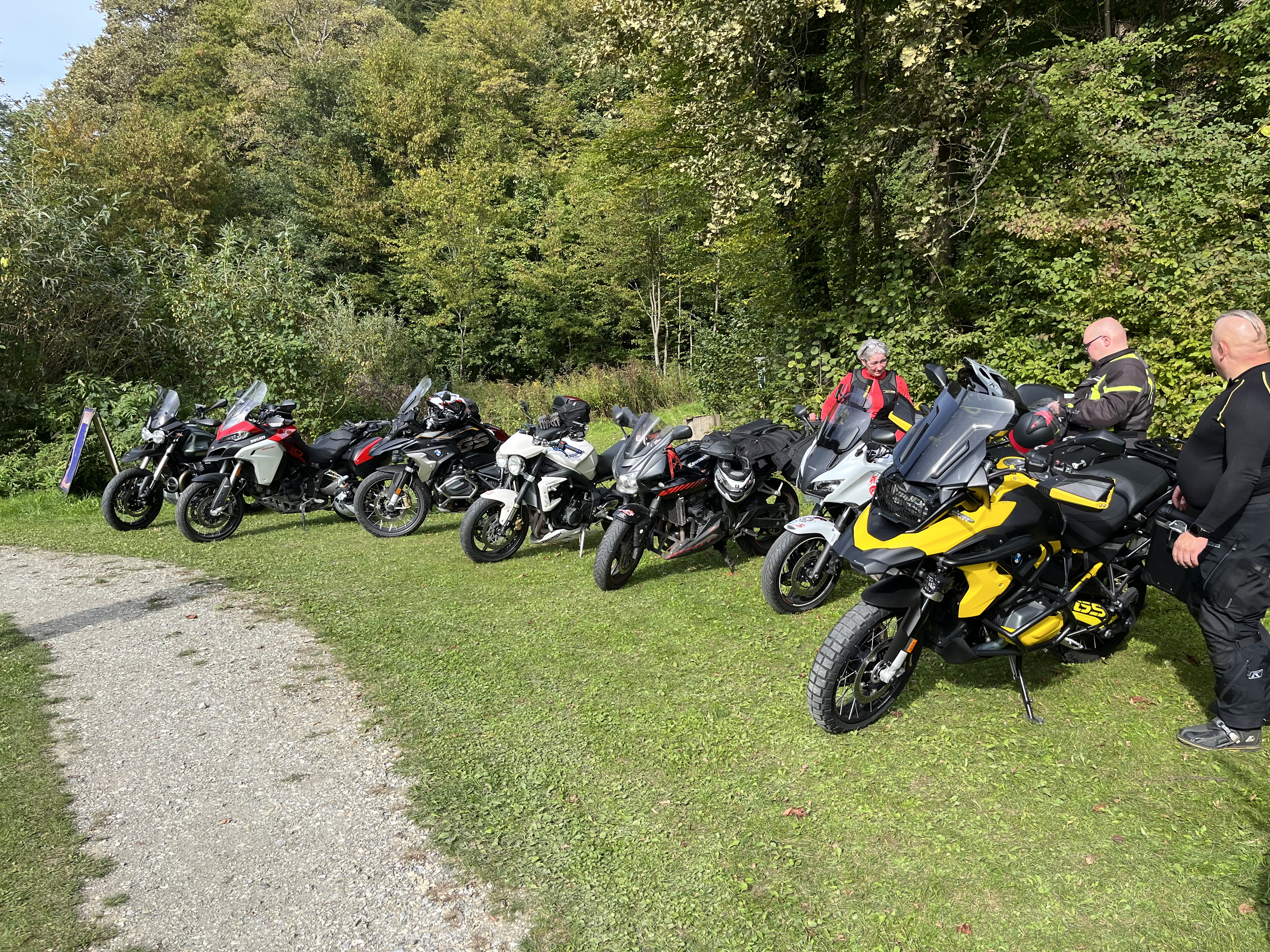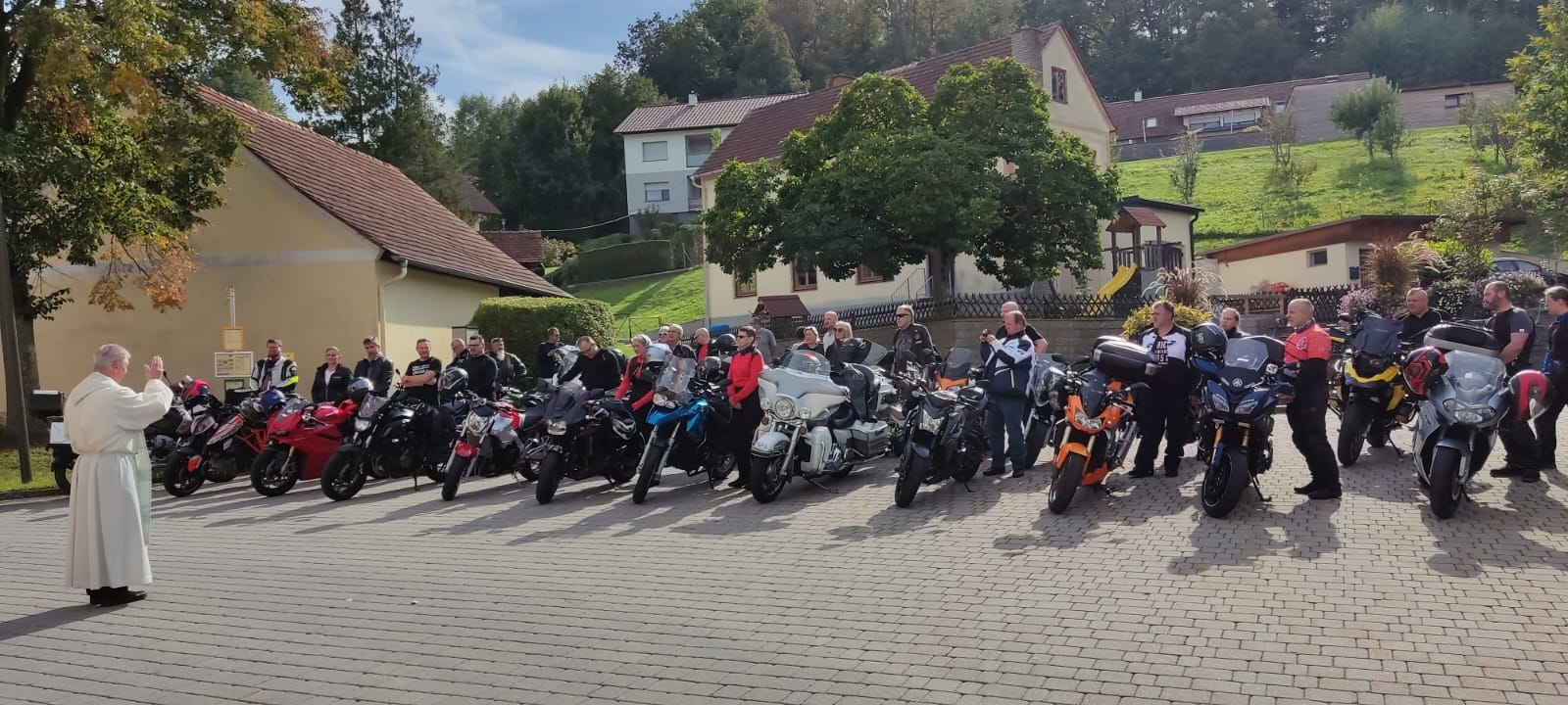 Die gemeinsame Ausfahrt startete um 13.15 Uhr. Die Route führte durch die südliche Steiermark bis zur Kirche in Loipersdorf. Hier gab es zur Überraschung aller eine besondere Aktion. Ein teilnehmendes Pärchen beging sein 20-jährige Ehejubiläum und gab sich zur Feier erneut das JA-Wort. Schließlich, und mit Gottes Segen, kehrten alle Biker gegen 16.00 Uhr zurück zum Teich. Ab jetzt standen Benzingespräche, Drinks und Food sowie viel Gelächter am Programm. Bis spät in die Nacht wurde ausgelassen am Lagerfeuer gefeiert.