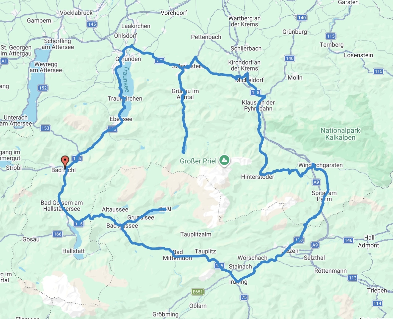 Wir biegen rechts ab, passieren Bad Mitterndorf, fahren durch Bad Aussee bis nach Gößl am Grundlsee. Über den Pötschenpass erreichen wir schließlich Bad Goisern am Hallstättersee und kommen schließlich zurück nach Bad Ischl.
