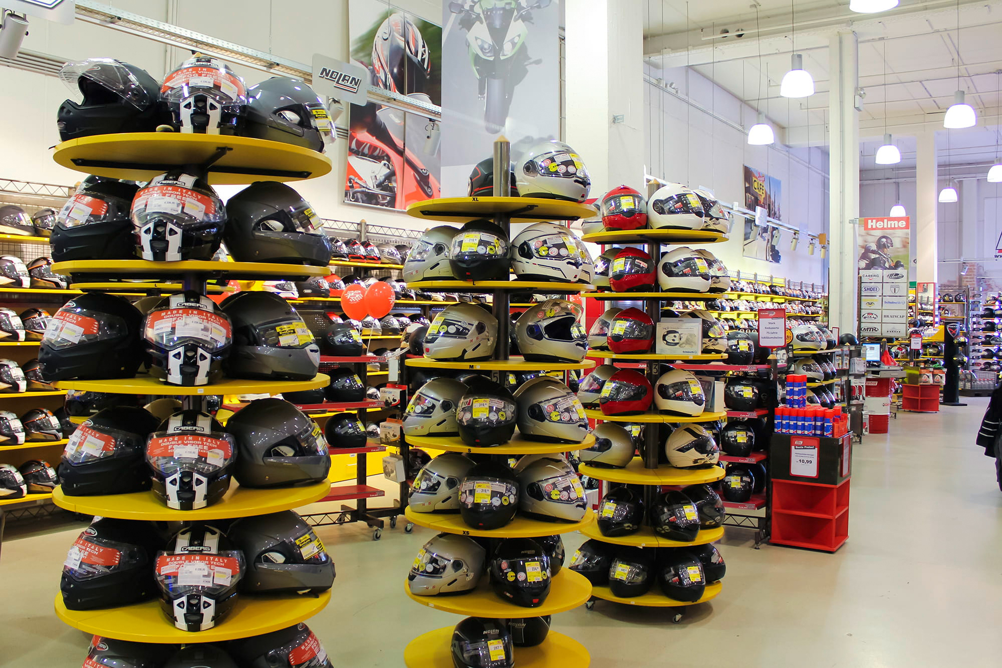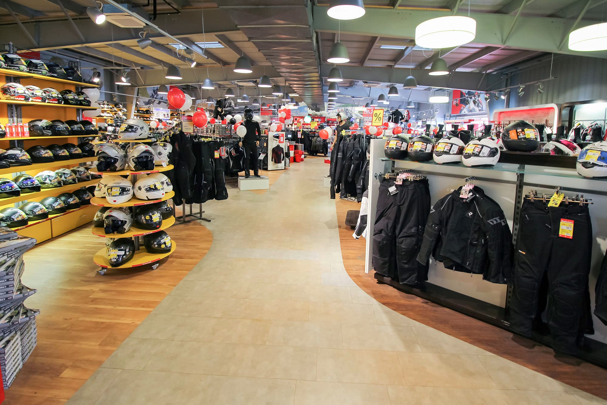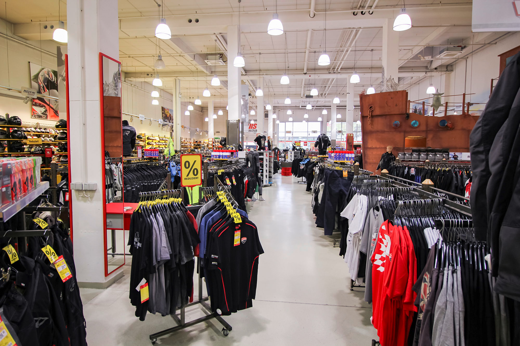 Deine Einkaufsreise beginnt direkt am Eingang und reicht bis in die hintersten Winkel. Motorrad soweit das Auge reicht. Die Geschäfte sind groß, weitläufig und vollgepackt mit allem, was du und dein Bike brauchen. Du gehst rein und siehst Hunderte Helme an der Wand. Du probierst an, vergleichst und stöberst. Die Auswahl ist kompromisslos.