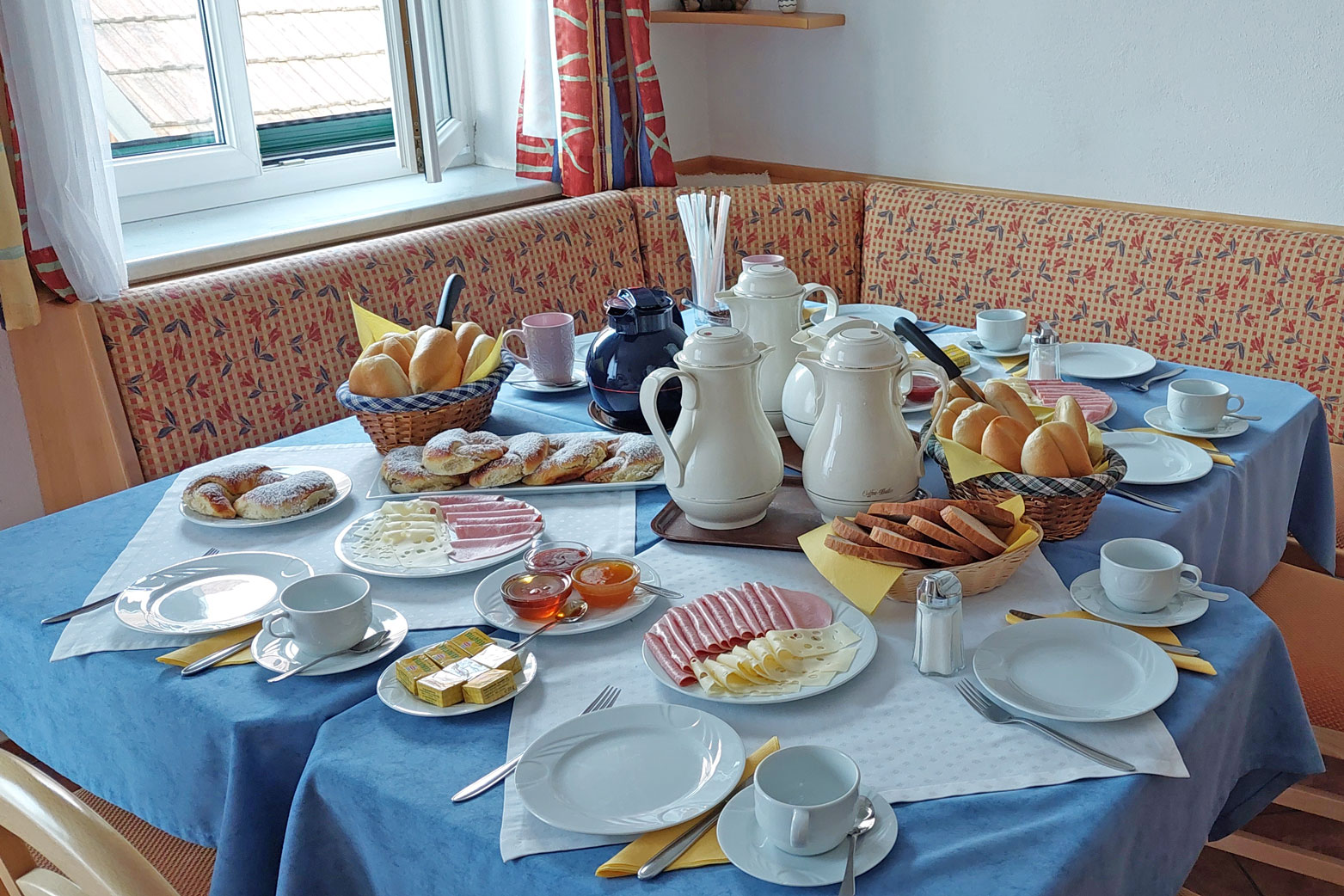 Am Morgen erwartet dich ein Frühstück mit regionalen Produkten und Selbstgemachtem. Kein Standardbuffet, sondern Dinge, die man nur aus Küchen kennt, in denen gern gekocht wird. Marmeladen, Aufstriche, Brot und vieles, was nach Zuhause schmeckt.