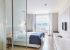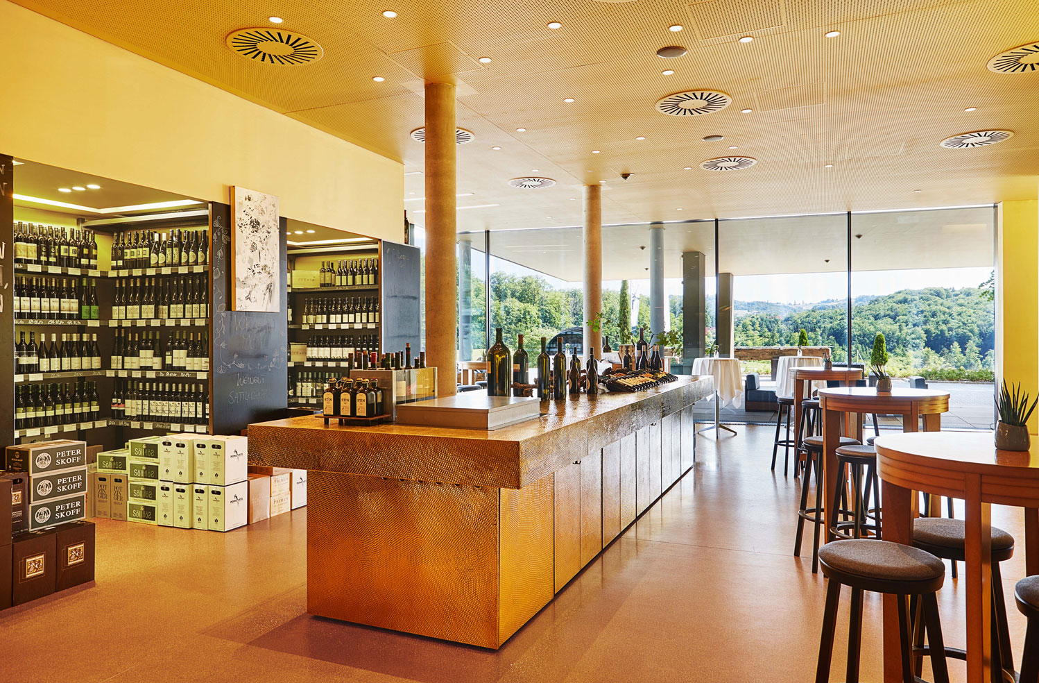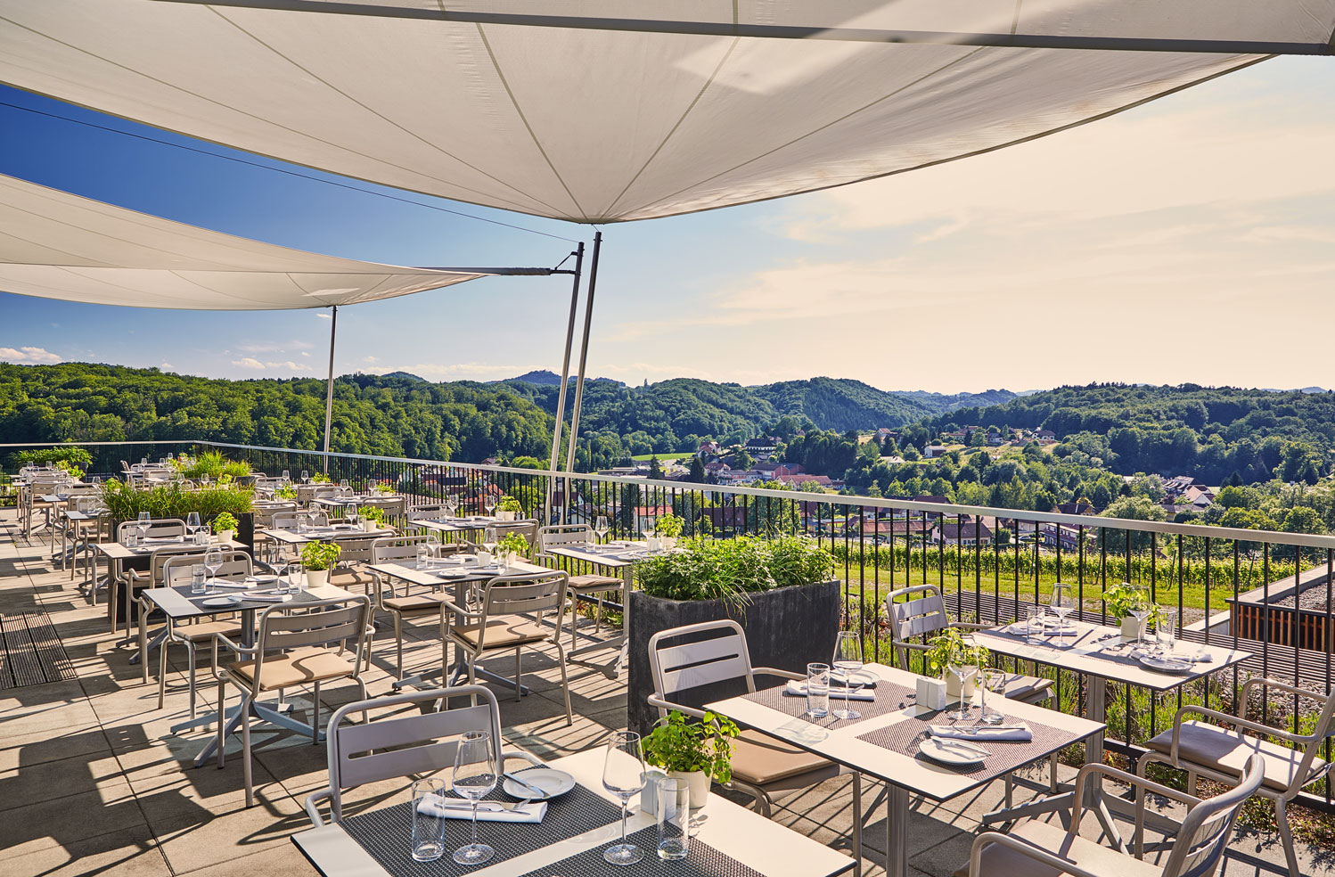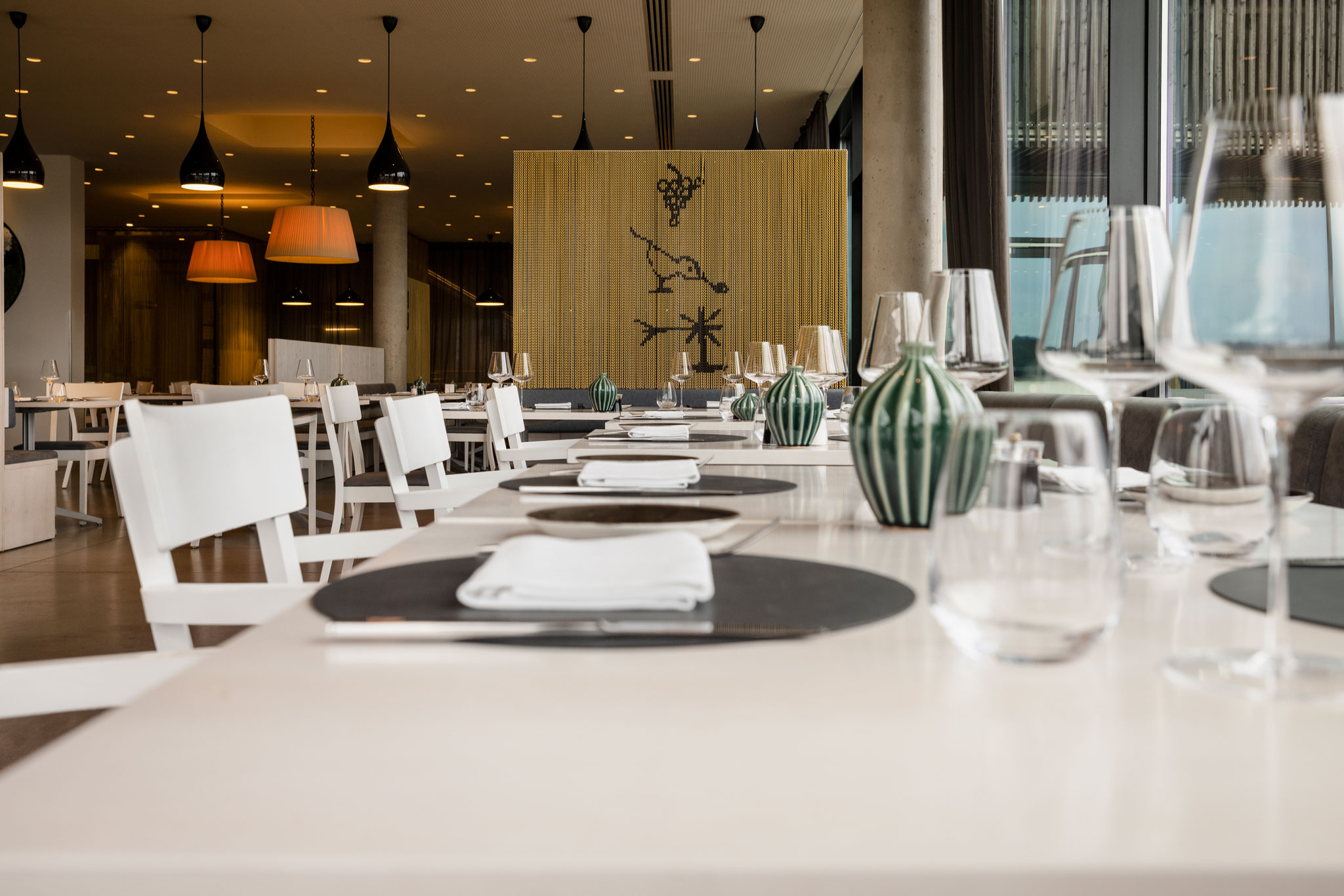 In den Zimmern herrscht moderne Architektur, geradliniges Design und viel Glas. Die umliegenden Weinberge verschmelzen regelrecht mit den Räumen. Das Interieur mit hellen Farben und klaren Formen schafft Platz, um zu sein und überlässt dem Naturspektakel die Bühne.