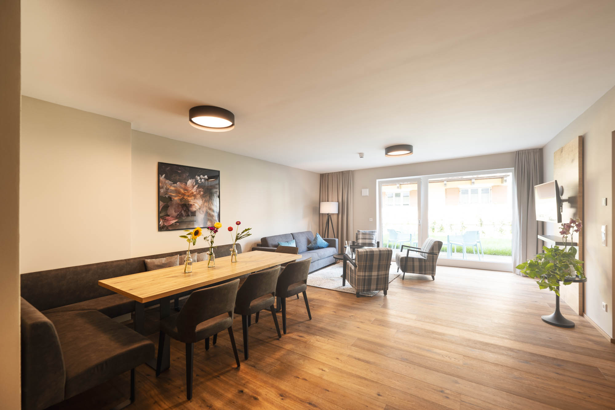 Fühl dich ganz wie Zuhause. Für deinen Aufenthalt kannst du aus 23 unterschiedlichen Apartments wählen. Du entscheidest dich für 1, 2 oder 3 Schlafzimmer - je nach Größe deiner Bikertruppe. Die extrem hochwertige und fein abgestimmte Einrichtung lässt keine Wünsche offen. Eine voll ausgestattete AEG-Küche, einladender Essbereich mit zentralem Tisch sowie höchster Schlafkomfort nach dem Konzept "Gesunder Schlaf" garantieren einen Wohlfühlurlaub der besonderen Art.